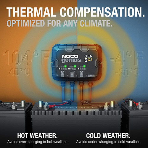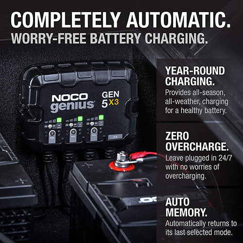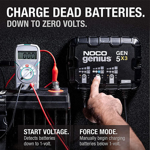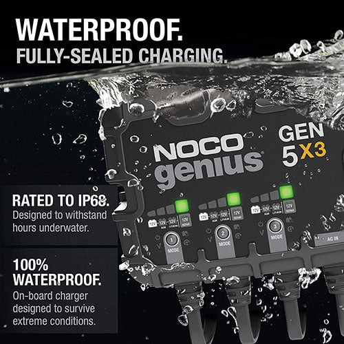 Meet the all-new GEN5X3. Similar to our GENM3, only better. It's 37% smaller and delivers 43% more power. It's one of the best performing onboard marine battery chargers we have ever made. A three-bank onboard battery charger rated at 15-amps (5-amps per bank) for 12-volt batteries, including marine, boat, starter, and deep-cycle batteries. Independently charge and control each battery bank with selectable charging modes - including 12V, 12V AGM, 12V Lithium, and 12V Repair Mode - for all types of lead-acid and lithium-ion batteries.Multiple-banks- A three-bank on-board battery charger rated at 15-amps (5-amps per bank) for 12-volt batteries, including marine, boat, starter, and deep-cycle batteriesCharging modes - Independently charge and control each battery bank with selectable charging modes - including 12V, 12V AGM, 12V Lithium, and 12V Repair Mode - for all types of lead-acid and lithium-ion batteriesEnjoy precision charging - An integrated thermal sensor detects the ambient temperature and alters the charge to eliminate over-charging in hot climates and under-charging in cold climatesCharge dead batteries - Charges batteries as low as 1-volt. Or use the all-new force mode that allows you to take control and manually begin charging dead batteries down to zero voltsRestore your battery - Automatically detects battery sulfation and acid stratification to restore lost battery performance for stronger engine starts and extended battery lifeBeyond maintenance - It's not just a trickle charger, it's an advanced battery maintainer. A fully-automatic, worry-free battery charger for everyday use - 24/7 - with zero overchargeRedefined mounting - A simplified mounting system allows for quick and easy installations in any direction - even up-side-down - with an integrated anti-vibration backing to isolate shock, vibration, and noiseDesigned for water - A fully-sealed and waterproof onboard battery charger with an ingress protection rating of IP68, but has survived brutal life cycle testing, including thousands of hours underwater