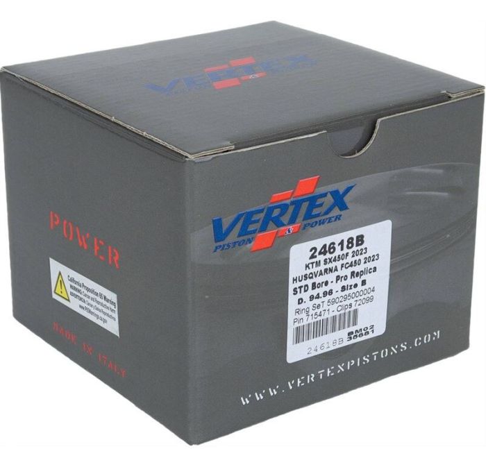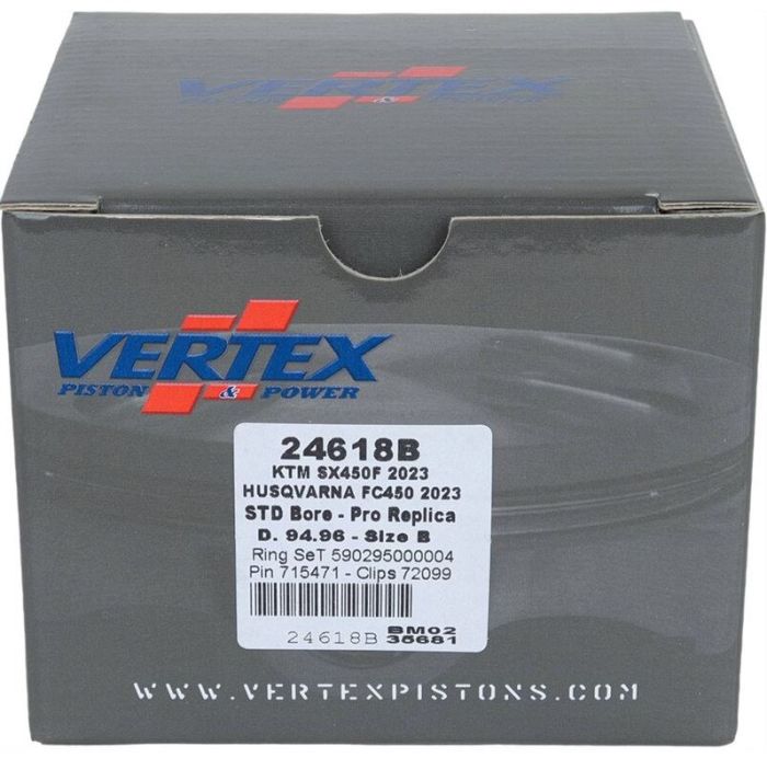 DescriptionVertex Forged Replica Piston KitFits Models450 SMR (23); 450 SX-F (23-24); 450 SX-F Factory (22-23); 450 XC-F (23-24); FC 450 (23-24); FC 450 Heritage Edition (23); FC 450 Rockstar Edition (23); FS 450 (23); FX 450 (23); MC 450 F (24)SpecsCompression Ratio13.1:1Cylinder Diameter95 mmDisplacement450 ccPiston Diameter94.960mm