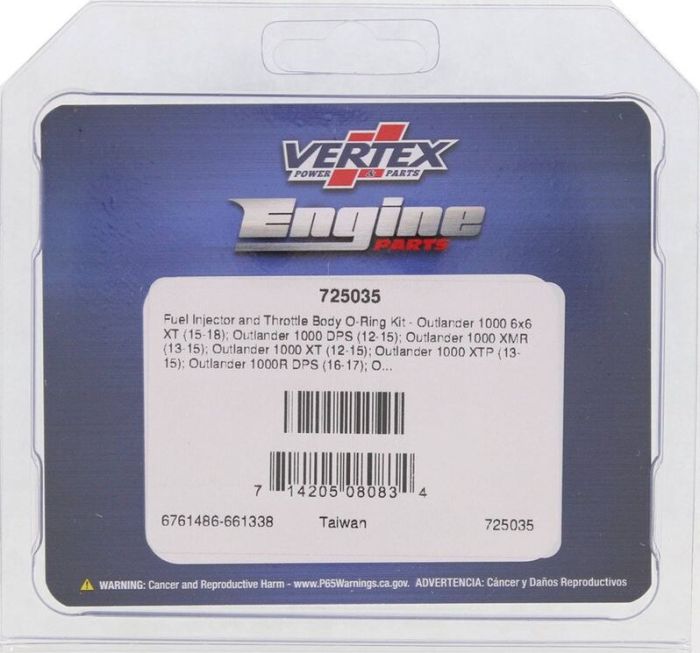 DescriptionVertex Fuel Injector and Throttle Body O-Ring KitFits ModelsOutlander 1000 6x6 Pro (18-19); Outlander 1000 6x6 Pro+ (20); Outlander 1000 6x6 XT (14-19); Outlander 1000 DPS (12-15); Outlander 1000 Pro (17); Outlander 1000 XMR (13-15); Outlander 1000 XT (12-15); Outlander 1000 XTP (13-15); Outlander 1000R DPS (16-17); Outlander 1000R XMR (16-17); Outlander 1000R XT (16-17,22-23); Outlander 1000R XTP (16-17); Outlander 500 4x4 (10-15); Outlander 500 4x4 LTD (10); Outlander 500 4x4 XT (10-14); Outlander 570 (17-23); Outlander 570 DPS (16-23); Outlander 570 Hunter Edition (16-20); Outlander 570 MR (22-23); Outlander 570 Pro (17-19); Outlander 570 XMR (16-23); Outlander 570 XT (16-23); Outlander 650 4x4 (10-15,17-22); Outlander 650 4x4 XT (10-22); Outlander 650 4x4 XT [Euro] (23); Outlander 650 6x6 (15-18); Outlander 650 6x6 Pro (19); Outlander 650 DPS (16-22); Outlander 650 Pro (16-20); Outlander 650 XMR (13-22); Outlander 650 XMR [Euro] (23); Outlander 800 XMR (11-12,15); Outlander 800 XXC (11); Outlander 800R (09-15); Outlander 800R DPS (15); Outlander 800R XT (09-15); Outlander 800R XTP (10-11,15); Outlander L 500 (15); Outlander L 570 (16); Outlander L 570 LE (16); Outlander L Max 500 (15); Outlander L Max 570 (16); Outlander Max 1000 (13-16); Outlander MAX 1000 6X6 XT (21); Outlander Max 1000 LTD (13-15); Outlander Max 1000 Pro (17); Outlander Max 1000 XT (13-15); Outlander Max 1000 XTP (13-15); Outlander Max 1000R (17); Outlander Max 1000R 6x6 XT (19-20); Outlander Max 1000R LTD (16-17); Outlander Max 1000R XT (16-17,23); Outlander Max 1000R XTP (16-17); Outlander Max 500 4x4 (10-15); Outlander Max 500 4x4 XT (10-15); Outlander Max 570 (16-23); Outlander Max 570 DPS (16-23); Outlander Max 570 Pro (19); Outlander Max 570 XT (16-23); Outlander Max 650 4x4 (11-15); Outlander Max 650 4x4 XT (10-14,21-22); Outlander Max 650 4x4 XT [Euro] (23); Outlander Max 650 6x6 (19-21,23); Outlander Max 650 6x6 XT (17); Outlander Max 650 DPS (19-22); Outlander Max 650 XTP (10-12,15); Outlander Max 800R 4x4 (09-14); Outlander Max 800R 4x4 LTD; Outlander 570 XMR (17-19); Outlander 650 4x4 XT (15-18); Outlander 650 DPS (16); Outlander 800R XT (15); Outlander L Max 570 (16); Outlander Max 1000 LTD (13-14); Outlander Max 500 4x4 XT (15); Outlander Max 570 XT (16-19); Renegade 500 (12); Renegade 800R XXC (15); Outlander 650 4x4 XT (15-18); Outlander 650 DPS (16); Outlander 800R XT (15); Outlander L Max 570 (16); Outlander Max 1000 LTD (13-14); Outlander Max 500 4x4 XT (15); Outlander Max 570 XT (16-19); Renegade 800R XXC (15)