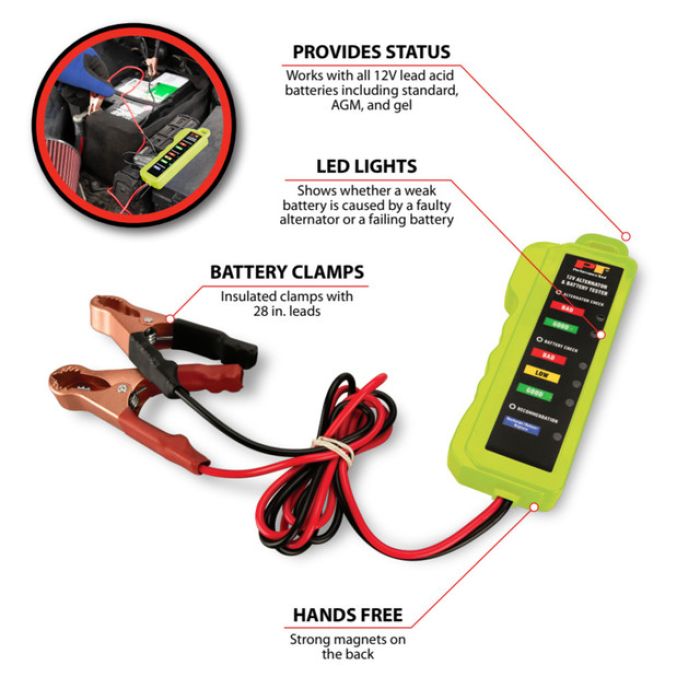 LED battery tester for all 12 volt systemsEasy to read L.E.D. lightsDetermines battery state of charge and level of alternator output