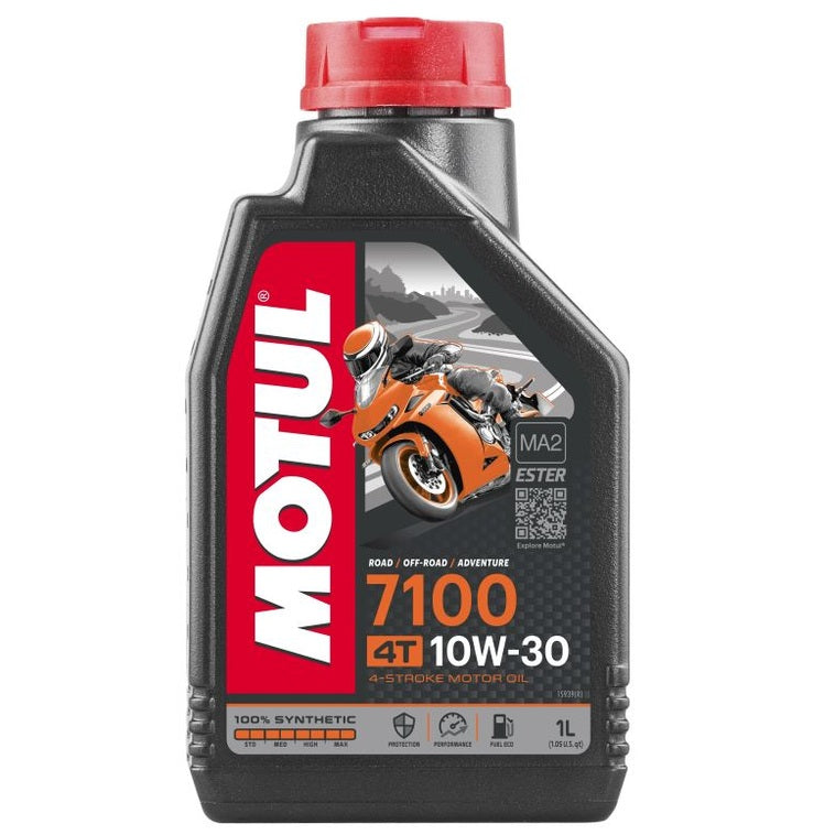 Motul 7100 is designed for severe conditions in sport and adventure riding. A best-in-class motor oil for maximal protection dedicated to providing the best performances for on-road and off-road riding. Suitable for any type of high performance motorcycle with 4-stroke engine, with or without integrated gearbox, wet or dry clutch. Perfect for motorcycles with catalytic converters or secondary air injection. Other applications include ATVs, UTVs, SxS, personal watercraft (PWC) or snowmobiles depending on manufacturer’s viscosity recommendationFull Synthetic4T10W30Meets JASO MA2 (2023), API SP1 Liter