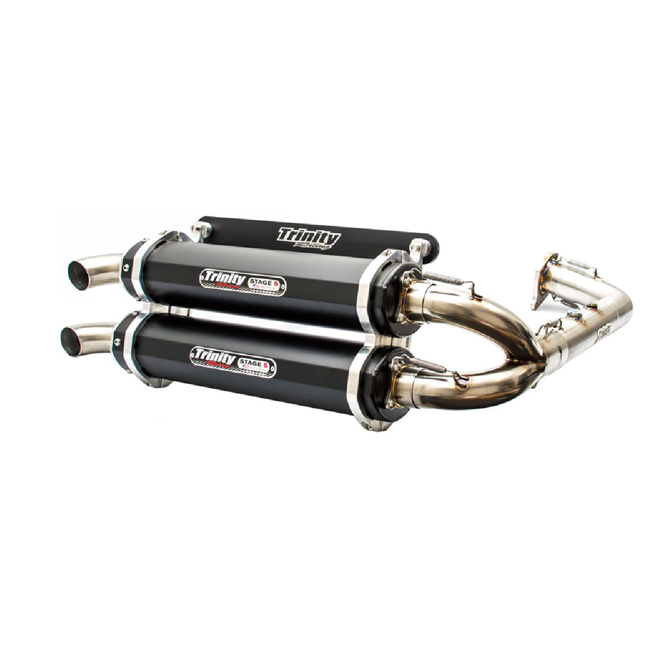 Every detail is precision-crafted, featuring fully TIG welded joints, an integrated oxygen sensor bung, and USFS-approved spark arrestors for optimal safety and reliability. High-quality 6061 billet muffler clamps and machined exhaust tips complete the design, providing a refined finish and durability. Experience significant performance gains and an enhanced exhaust note with this newly designed Stage 5 system, backed by a 5-year warranty when used with a Trinity Racing Fuel Tuner.